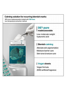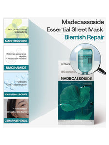 Mediheal's Madecassoside Essential mask targets blemishes and skin pigmentation for clearer skin. Using 3 kinds of cica to calm, soothe, and clear skin while reducing the appearance of post-blemish marks and discoloration. The Cica Active 3X complex uses 4-centella complex, 3-Teca complex, and Phytoalexin (Resveratrol) to improve cell turnover and improve the skin tone to become clearer and even looking. Uses Mediheal's patented HydroDeeper complex that has essential moisturizing factors to help improve hydration and maintain a heathy skin barrier. This mask features a biodegradable bamboo cellulose sheet that is silky soft and firmly hugs skin for optimal absorption.